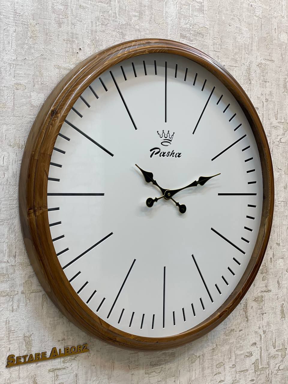 ساعت دیواری گرد مدرن و شیک با طراحی منحصر به فرد و صفحه سفیدو خطوط مشکی ، مناسب برای افزودن ظرافت به هر دکوراسیونی.