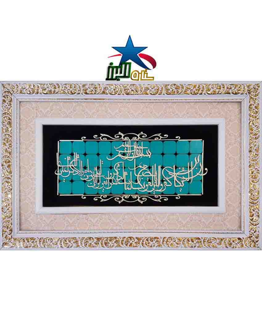 One and the same quadrilateral islamic poem, Hamad Tawhid Yas Val-e’zr Salavat, and five names and names of the prophets of Turquoise leather and cashmere mosaic.